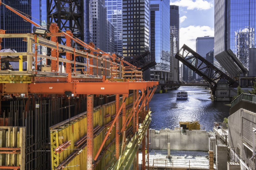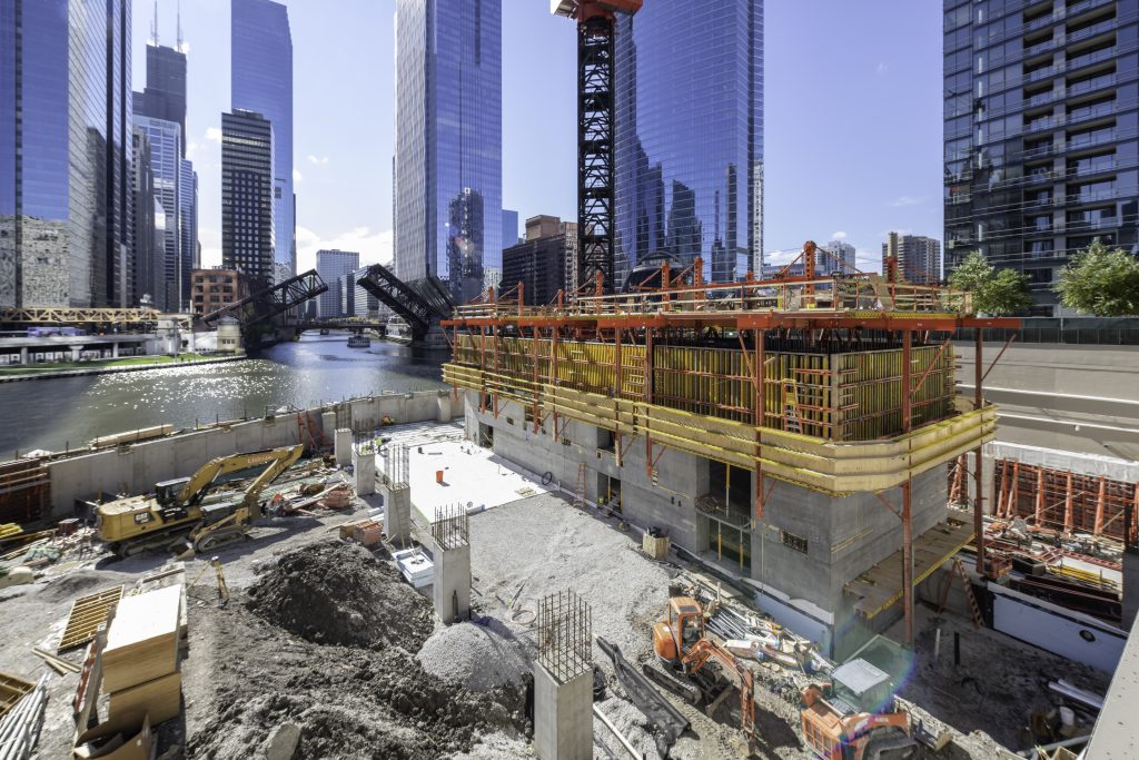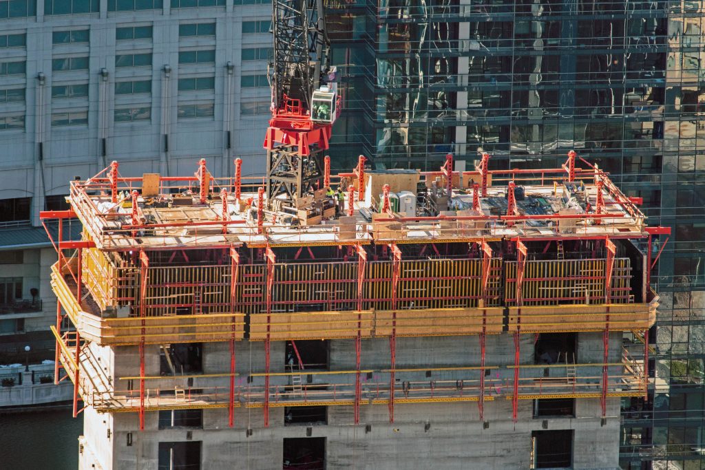 Salesforce Tower Chicago is a high-rise building with steel structures and a massive, four-cell vertical concrete core, which supports the tower. PERI collaborated with the project team to develop a specific sequence and schedule for delivering critical formwork components as ready-to-use systems just-in-time for use.