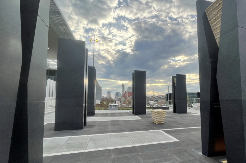 A focal point of the artwork is a monument by St. Louis resident and nationally-acclaimed artist Damon Davis located at the southwest corner of the stadium site. The monument features a series of 10- to 12-foot, black granite and limestone pillars, each in the shape of an hourglass. Interpretive signs, maps and quotes from Mill Creek Valley residents also tell the story of the community that was cleared because of what the city described as “urban renewal.” The name, age and occupation of each resident taken from the 1940 U.S. Census is displayed. Rows of hedges and benches represent the placement of former buildings, with their addresses listed.