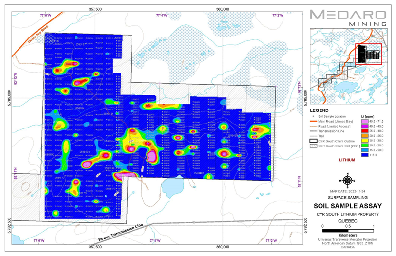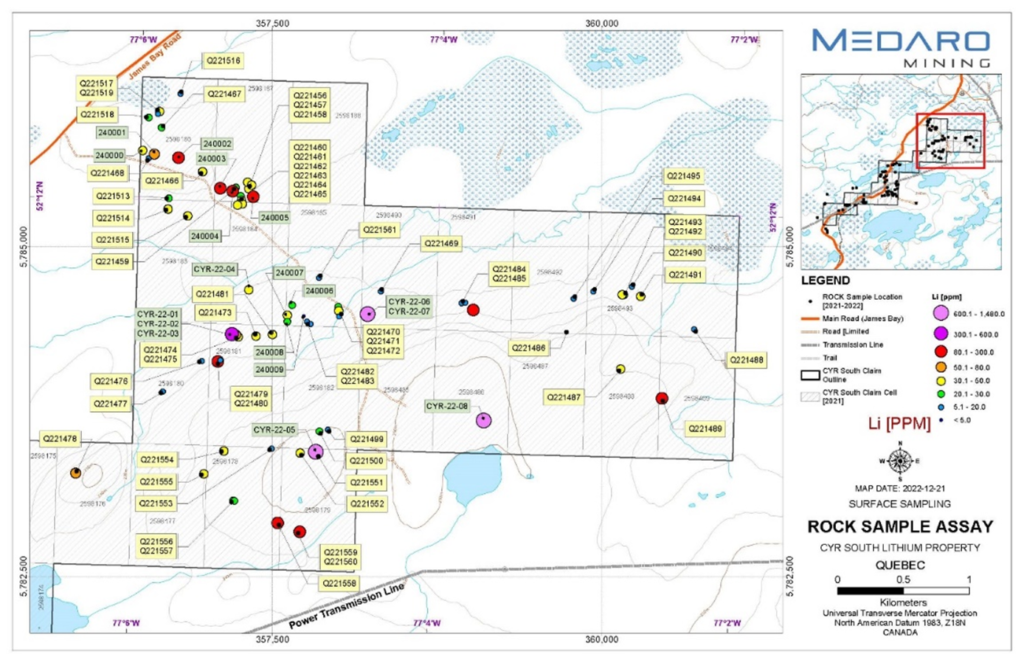 Medaro Mining Corp. (CSE: MEDA)(OTC:MEDAF)(FSE:1ZY) (“Medaro” or the “Company”) is pleased to announce the results of soil and rock samples from their 2022 exploration work on the CYR South Lithium Property (“CYR” or the “Property”) located in the James Bay Region of northern Quebec. The results indicate higher than expected lithium values in several pegmatites sampled across the Property. These pegmatites zones also show concurrent lithium anomalies in soil samples and will be further explored through trenching and drilling. Anomalous values of other rare metals, such as beryllium, cesium, niobium and tantalum, were also found in the soil and rock samples.