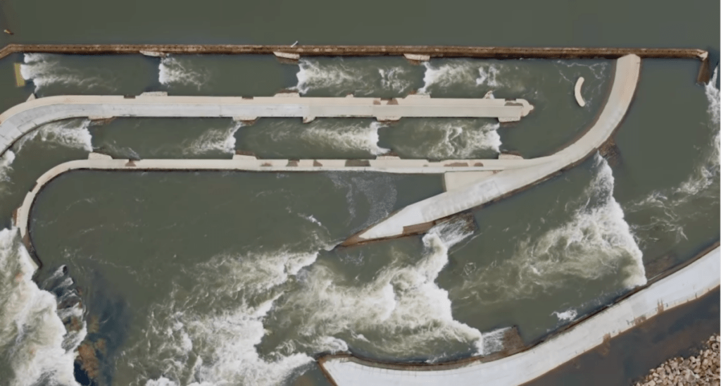 The 1,075-foot Recreation Bypass Channel (known locally as “the paperclip”) is a narrow, winding channel that features nine drop structures that control the rate and intensity of flows through the channel, a recovery pool, an island with gradually sloped sides, and portage trails for boaters to exit the channel if needed. The access channel’s design also incorporates special formations to prevent fish from being trapped at lower flows.