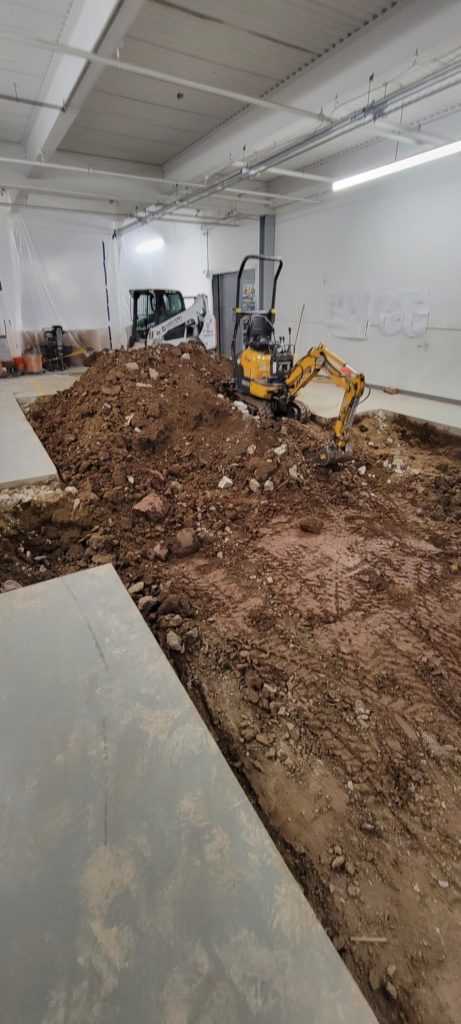 Because the plant operates 24-hours-a-day, Western’s craftsmen utilized an electric mini excavator and other electrical equipment to minimize fumes and noise while digging a trench in the plant’s 5-inch-thick concrete floor for the new pad.