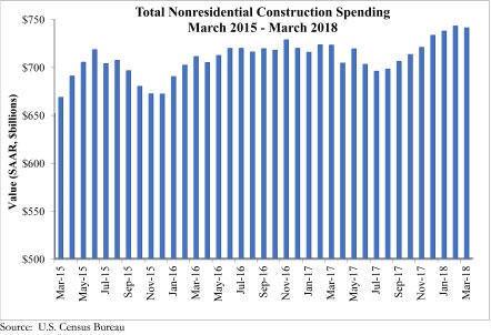 Washington, D.C. — Nonresidential construction spending declined 0.3 percent in March, according to an Associated Builders and Contractors (ABC) analysis of U.S. Census Bureau data. Nonresidential spending, which totaled $740.9 billion on a seasonally adjusted, annualized basis, has expanded 2.5 percent on a year-over-year basis. February’s spending estimate was revised roughly $10 billion higher, from $732.8 billion to $742.8 billion, rendering the March decline less meaningful.
