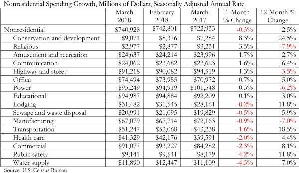 Private-sector nonresidential construction spending fell 0.4 percent on a monthly basis, but rose 2.2 percent from a year ago. Public sector nonresidential spending remained unchanged in March, but it is up 2.9 percent year-over-year.