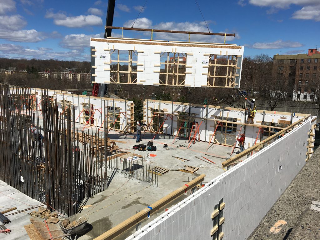42 Broad is a 16-story mixed-use development near New York City being built with Insulating Concrete Form (ICF). ICF construction is becoming more mainstream with thousands of projects built in the US, but still considered innovative by many. ICFs sandwich a reinforced concrete wall between forms made of rigid polystyrene insulation that stay in place after the concrete hardens. There are several taller ICF buildings in Canada, but at 16 stories, 42 Broad will be the tallest in the US.