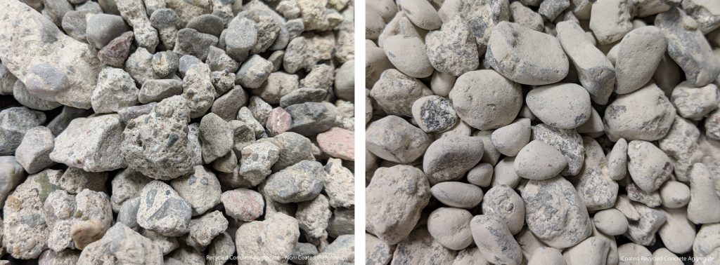 Recycled concrete particles are coated with synthetic limestone, forming a coating that is 44% by mass CO2. Photos: Blue Planet Ltd.