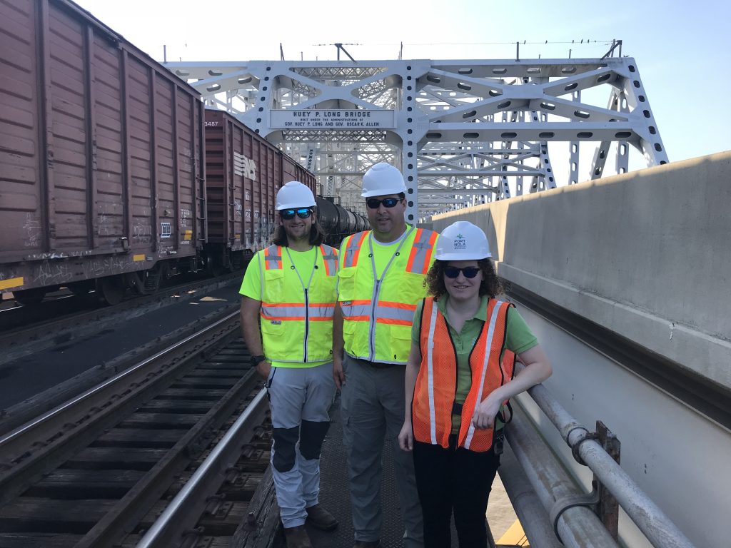 Brennon Albarez (left), field technician, and Andrew Milanes (center), VP of Es², consultants for the mapping pilot with Maggie Cloos (right), Port NOLA GIS manager on the railroad portion of the Huey P. Long Bridge over the Mississippi River. The team collected fixed asset features for the New Orleans Public Belt Railroad, such as rail line expansion joints and signals, using a Trimble R2 and T10 tablet with Esri Collector.