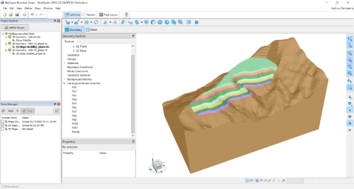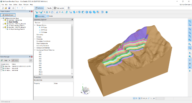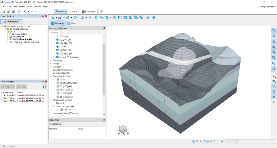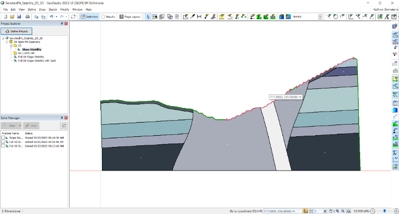SLOPE/W 2D cross-section of a benched open pit mine. Now you can expand your analysis into 3D within the same project file.