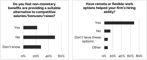In Zweig Group’s second Driven by Data Webinar: Recruitment and Retention, 65 percent of attendees reported that remote or flexible work options have helped their firm’s ability to hire. Adding to this, more than 23 percent of respondents who currently have remote and flexible work options, stated they would consider looking for a new job at a different firm if these options were made unavailable to them.