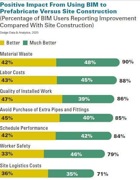 Many mechanical and HVAC contractors first started using 3D modeling in the 1990s to support their prefabrication efforts, and the study reveals that 87 percent of the participants are using BIM for prefabrication of at least some assemblies, with 46 percent using it for 50 percent or more of them. BIM for fabrication is widely adopted because most contractors are experiencing benefits from its use. In fact, over three quarters report that using BIM for fabrication improves six major benefits, from material waste to worker safety. Perhaps the most striking are the ones that are also important measures of project success, with 88 percent reporting improved labor costs, 86 percent reporting better quality of installed work and 84 percent reporting improved schedule performance because of using BIM for fabrication.