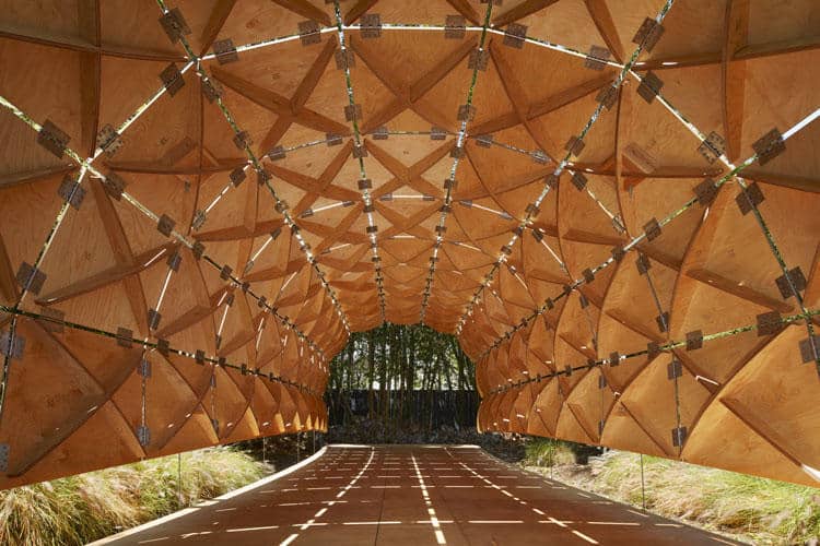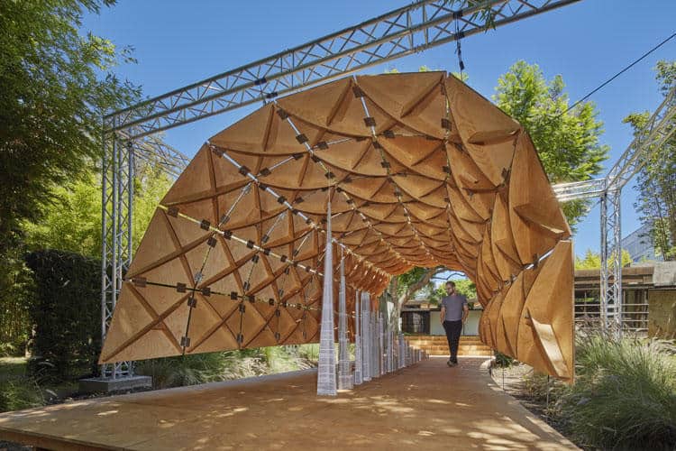 A SOM-designed pavilion is one of the centerpieces of the exhibition. It’s a one-of-a-kind, portable, 27-foot-long, kinematic outdoor pavilion made of hinged wood panels. SOM engineer Toby Mitchell came up with the idea for the structure after reviewing research Professor Tomohiro Tachi of the University of Tokyo is doing into “rigid origami.” The idea — implemented by a team from multiple SOM offices in the U.S. and internationally — was to create a structure that can be transformed into various configurations with minimal human effort and without deforming the individual panels.